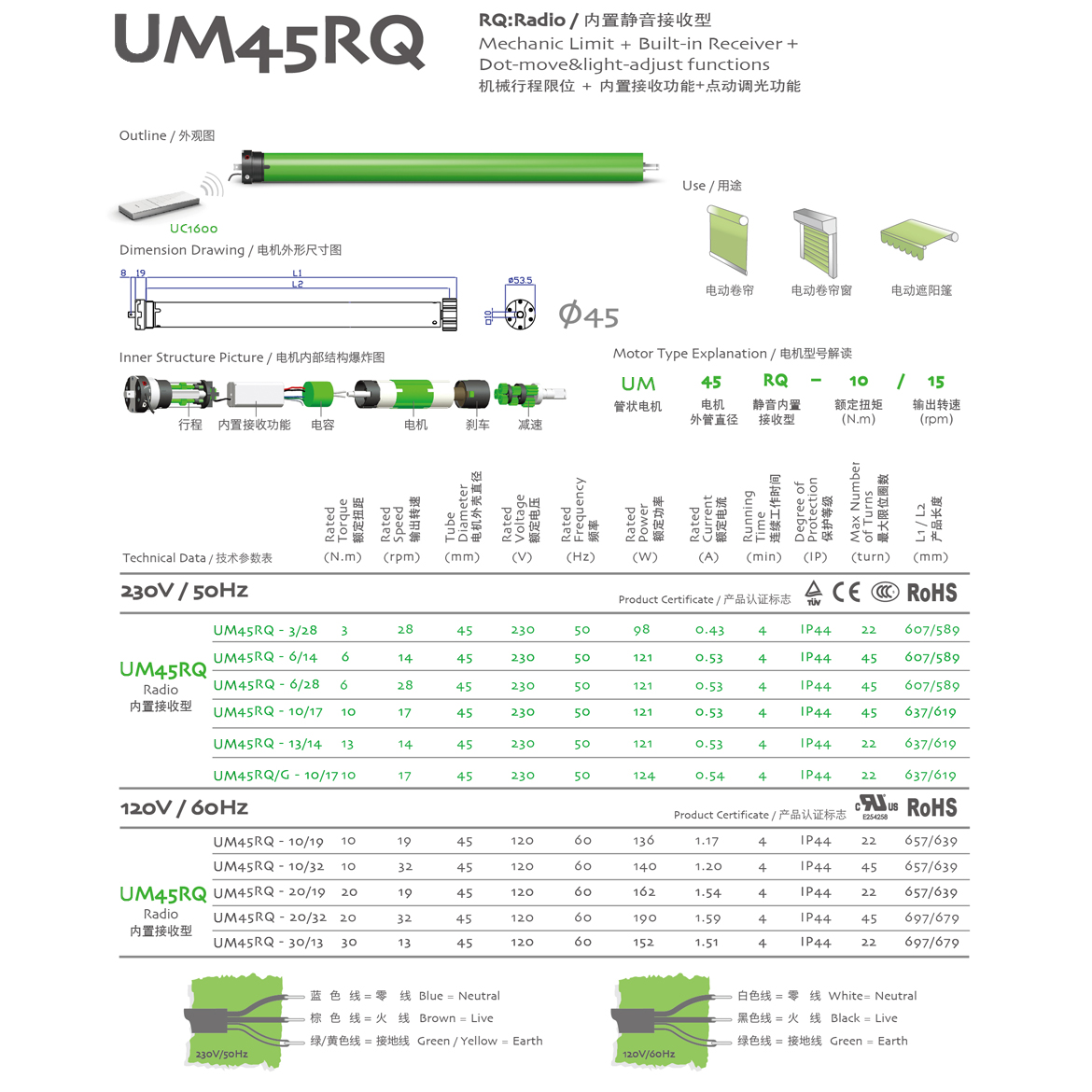 RQ:Quiet/靜音型 機械行程限位+內置接收器+點動調光功能+靜音功能